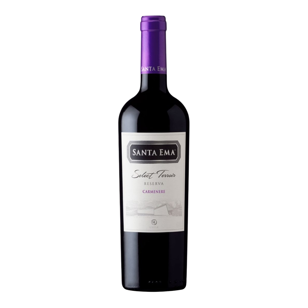 El Santa Ema Select Terroir Carmenere se presenta con un color rojo oscuro con matices violetas. En nariz, despliega aromas intensos a frutas negras como moras, arándanos y ciruelas negras, complementados con notas sutiles de tabaco y pimienta negra.